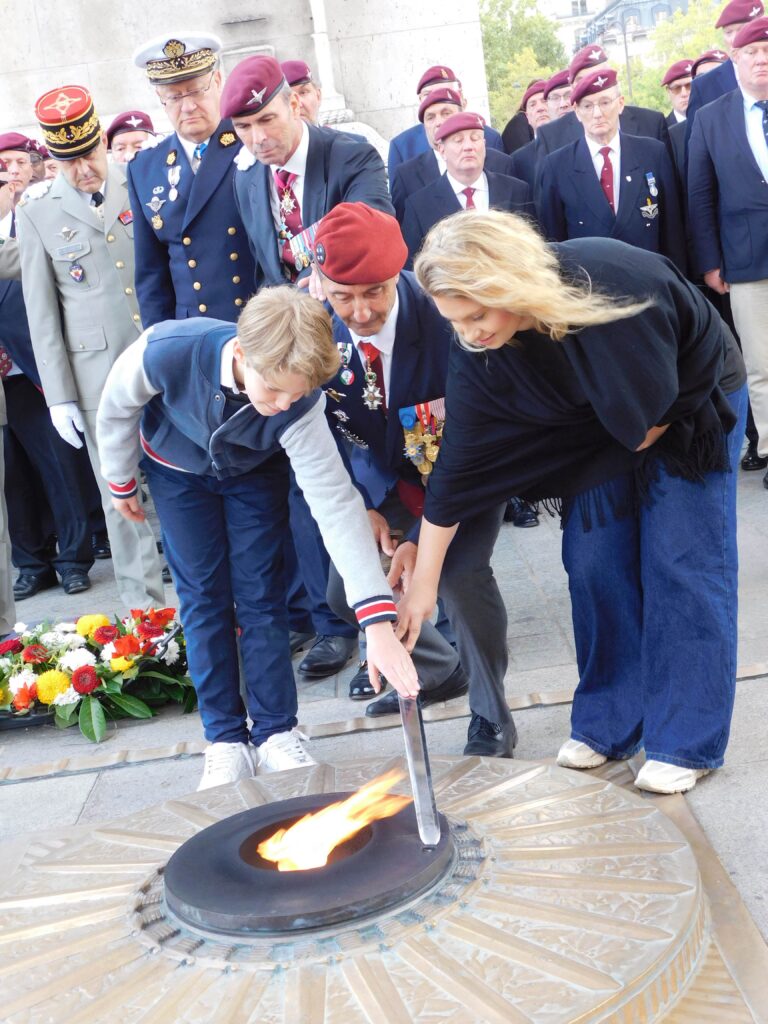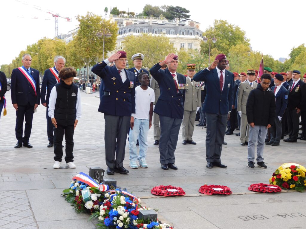 There followed a moving ceremony under the Arc. The French had very thoughtfully provided a secure area for our families, allowing them a great view of the proceedings. The Eternal Flame was rekindled by French children and blessed. General Munro laid a wreath on behalf of The Parachute Regiment and the Right Honourable Bayo Alaba MP laid one for the House of Commons.