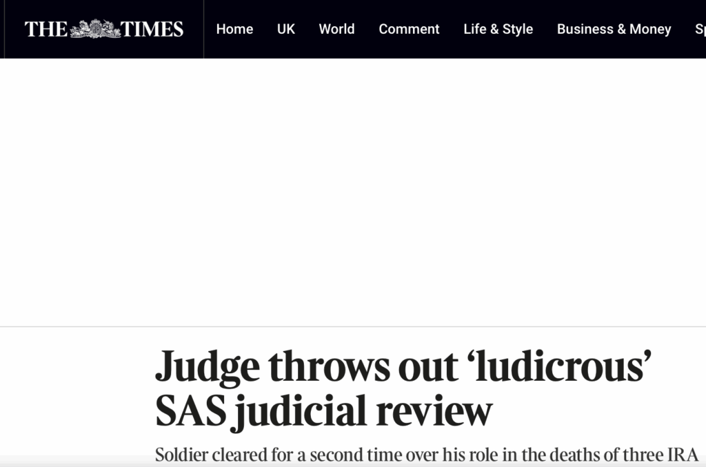 To further add to the political discourse, on 9th October 2025, Larisa Brown, Defence Editor of The Times, published an article under the heading ‘Judge throws out ‘ludicrous’ SAS judicial review’. In summary; a judge expressed his “surprise” and branded a taxpayer-funded judicial review application into the use of force more than three decades ago by the SAS to counter a Provisional IRA ambush as “ludicrous” and “divorced from reality”.